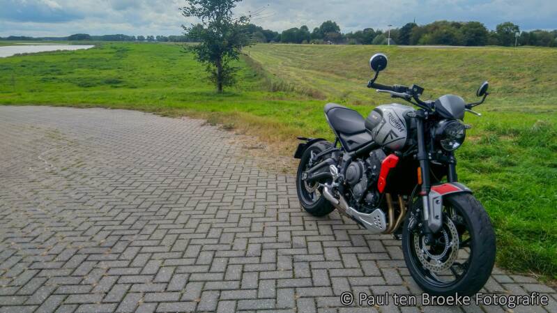Op pad maar. Meteen valt het rustige rijgedrag op. Hij reageert niet nerveus als de Street Triple (ik vergelijk het even met de 1e generatie Street Triple). Ik denk dat ik het rijgedrag meer mag vergelijken met de Street Twin. Ondanks de kleinere cilinderinhoud en de enkele injector valt de versnelling in hogere versnellingen niet tegen, je hoeft niet als een gek te schakelen om een gat dicht te rijden.